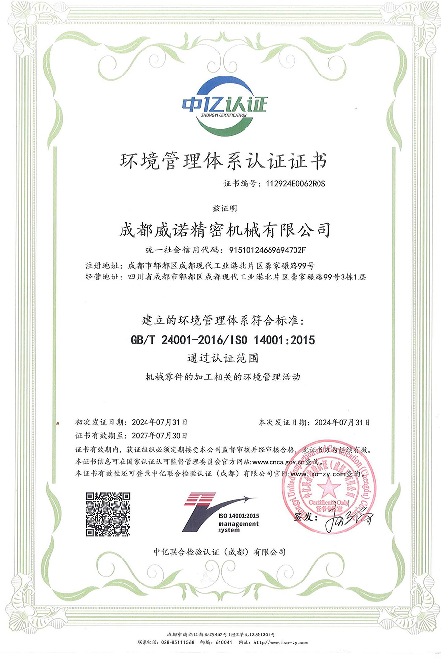 環(huán)境管理體系認(rèn)證證書